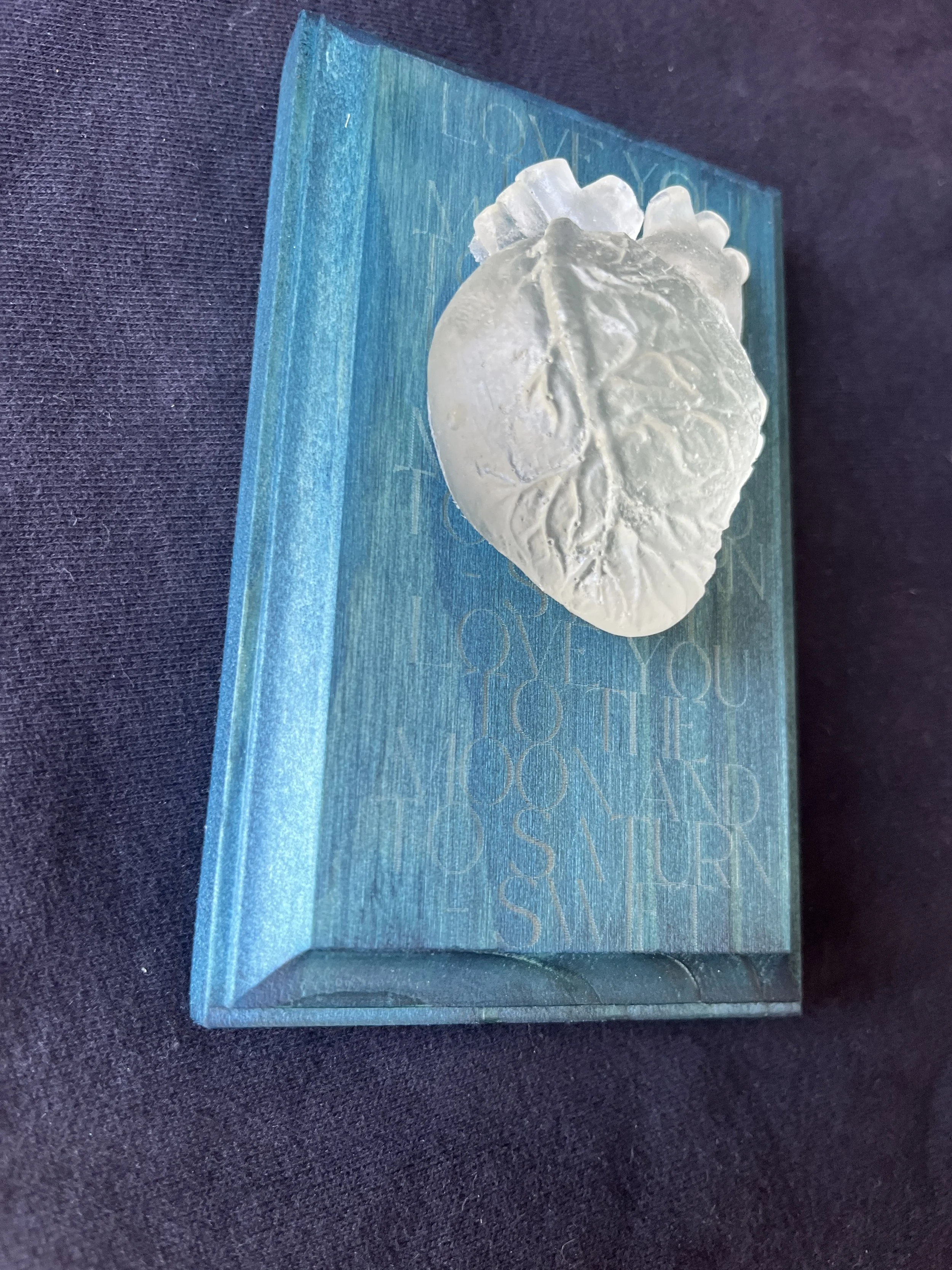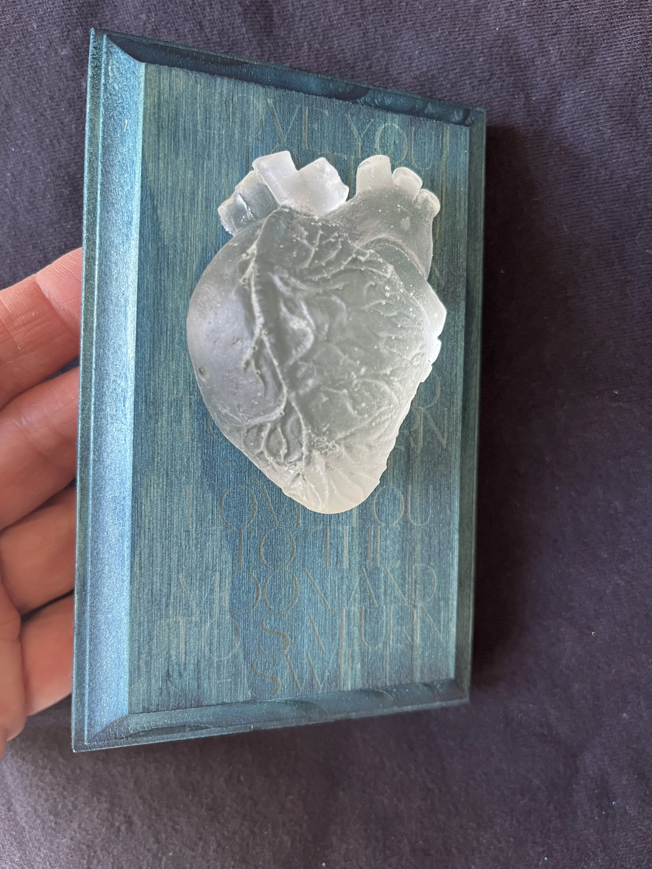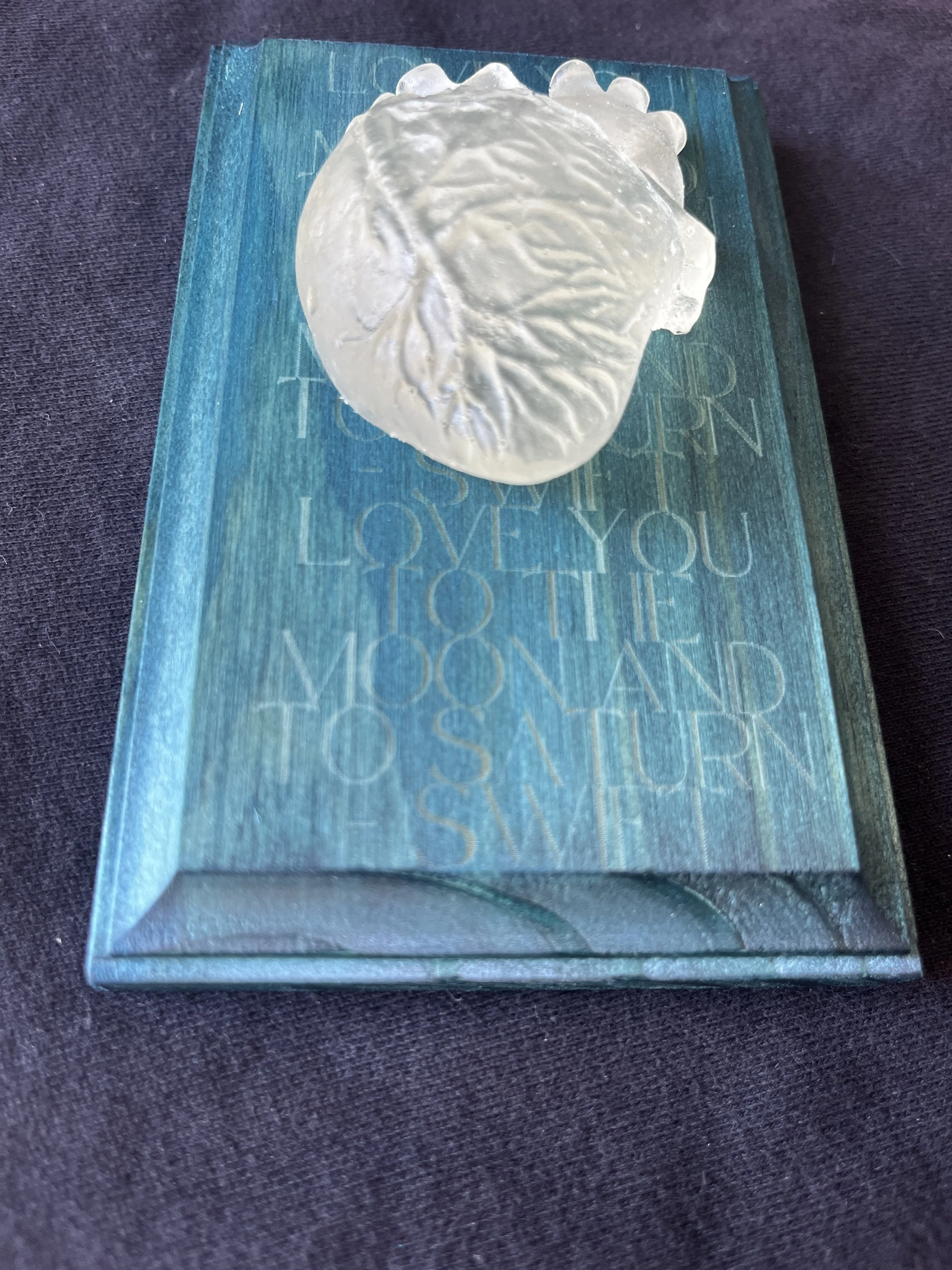 A round, speckled purple wooden moon elegantly showcases a mythical creature of the night: the elusive Jackalope. The craftsmanship of the moon's surface captures the enchanting essence of twilight, while the Jackalope, with its majestic antlers and whimsical presence, adds an air of mystery and folklore to this captivating piece.